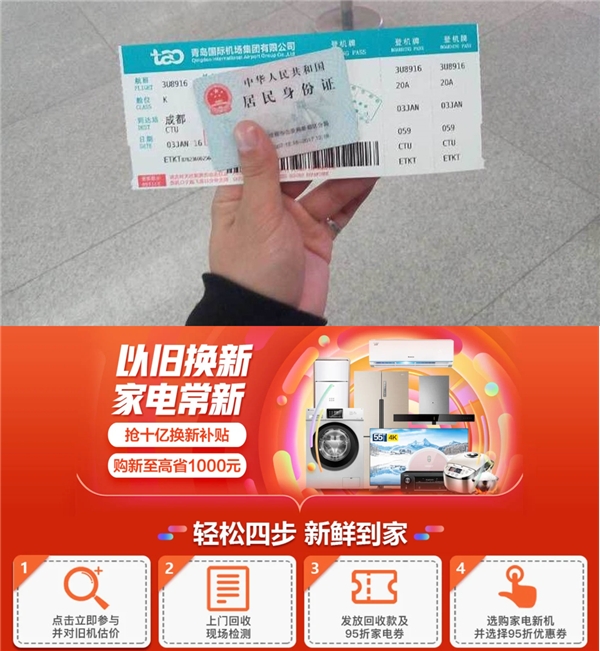 如果你觉得机票贵,那我告诉你家里很多老旧家电都可以借机升级,以旧换新。而用以旧换新得到的优惠券购买新家电,节省下来的钱毫无疑问足够给你买机票了。