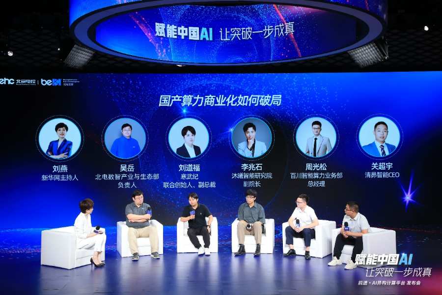 在AI芯片国产化进程加速的当下,如何促进应用生态优化升级,增强适配能力,让国产芯片商业化应用“落地有声”?在圆桌讨论环节,北电数智产业与生态部负责人吴岳,寒武纪联合创始人、副总裁刘道福,沐曦智能研究院副院长李兆石,百川智能算力业务部总经理周光松,清昴智能CEO关超宇等多位嘉宾围绕“国产芯片商业化如何破局”主题分享各自思考。