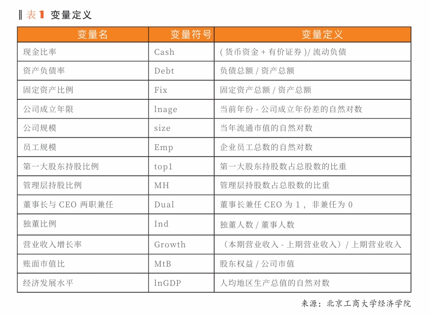 综上所述,我们选取现金比率(Cash)、资产负债率(Debt)、固定资产比例(Fix)、成立年限(lnage)公司规模(size)、员工规模(Emp)、第一大股东持股比例(top1)、管理层持股比例(MH)、董事长与CEO两职兼任(Dual)、独董比例(Ind)、营业收入增长率(Growth)、账面市值比(MtB)作为本文针对企业的控制变量。然而,经济发展水平与绿色技术创新之间的关系存在不确定性,加入人均GDP对数(lnGDP)作为控制变量。具体控制变量定义见表1。