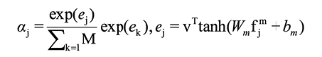 其中αj表示第j个模态的注意力权重(无量纲),exp指数函数,tanh双曲正切激活函数,vT向量v的转置,M表示模态总数(个),ek第k个模态的注意力得分(无量纲),k求和中的模态索引(k从1到M),ej表示第j个模态的注意力得分(无量纲),v表示注意力参数向量(维度为隐层单元数),Wm表示模态特征变换矩阵(维度为隐层×特征维度), fmj表示第j个模态的特征向量(维度根据具体模态确定),bm表示偏置向量(维度为隐层单元数)。该公式可确保不同模态信息,依据其重要性合理融合,并提升综合判断的准确性。
