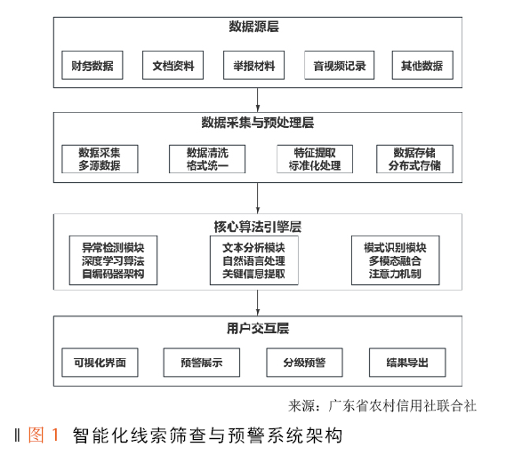 智能化线索筛查与预警系统可以通过运用分层架构来进行设计,实现各类功能贯通融合,充分提高运行效果,如图1所示。首先系统底层是数据采集与预处理模块,该模块负责从多个不同数据源获取原始信息并做标准化处理。中间层部署核心算法引擎包含异常检测、文本分析及模式识别等模块,不同模块通过协同工作可以实现对各类问题线索更加精准智能识别。系统顶层设有用户交互界面以及预警展示模块,该模块可把识别结果以可视化方式呈现给巡视巡察工作人员,并且还可以依据问题严重程度进行分级预警,整个系统架构保证了数据流的顺畅传递以及算法模型高效运行。