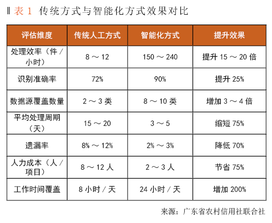 挑选江苏、广东及浙江等省份的12家巡视巡察机构,运用前后对比的分析方法,通过进行系统数据分析来收集18个月的效果数据。研究发现,巡视巡察智能化系统在处理效率、识别准确性及覆盖范围等多个维度明显比传统人工方式更具优势。在处理效率方面,智能化系统的处理效率提升了15~20倍,大幅缩短了线索筛查工作的周期;在识别准确性方面,识别准确率提升了约25%,有效避免了人工判断产生的主观偏差;在人力成本方面,智能化系统能够大幅度减少人力资源成本,节省达75%以上,具体如表1所示。与传统巡视巡察方式相比,智能化系统为全面提升巡视巡察工作的现代化转型提供了坚实的技术支撑。