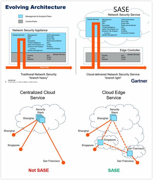 Gartner通过架构图,进一步阐明SASE与传统安全架构的对比