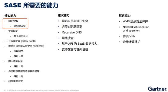 SASE,Secure Access Service Edge,即具备安全接入服务的边缘终端,也被认为是SD-WAN技术面向全互联整体安全的演进技术,值得所有准备参与到数字化新基建的企业与用户花时间好好研究。根据全球最具影响力的IT研究机构Gartner,SASE,起源于网络服务与安全服务的碰撞对接,从而形成了更新一代的网络接入与安全服务总成。IT资产身份认证是其核心原则,云原生架构,微服务形态,特别适配于工业互联网,物联网,云计算与边缘计算,个人不同时间与地点接入SaaS和第三方非认证终端接入核心业务等场景。其核心能力包含SD-WAN与其他微型化的安全服务能力(软模块),可以完全部署在云端、容器以及小型终端,请见下图: