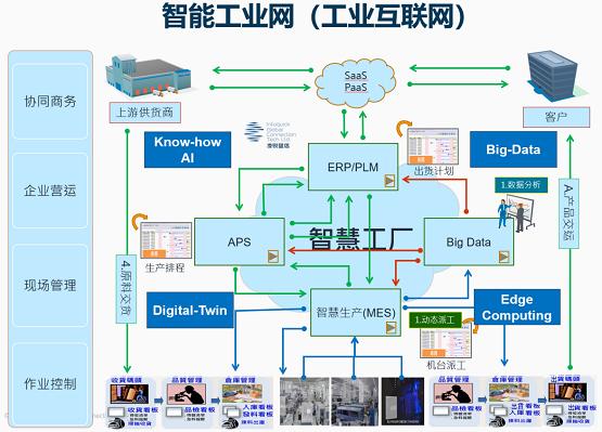 下图展现了在工业智能制造领域,数据传递到零件供货商、排程体系、动态派工体系等各个环节,实现各环节精确配合,达成定制化智造的产出: