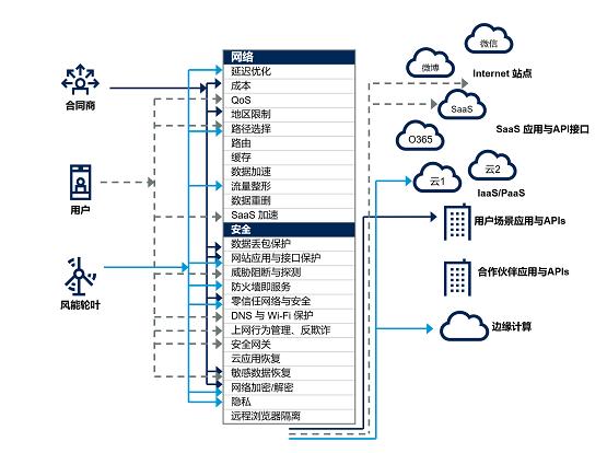 可以看出SASE(具备安全接入服务的边缘)在SD-WAN无缝连接能力支持下,集成多种安全服务能力,并软件化、微型(服务)化,将足够强的安全能力输出到各端,通过身份认证这一原则,确保在复杂融合性的业务场景中,达成各方应用数据、终端、设备等多种IT资产的保护。对于企业用户,可使用不同终端,在不同的时间、地点,随意安全接入SaaS;而对于设备本身,保密性的传感数据、地理位置等,可以通过本地网传输到云端,用于数据收集与分析;最后,对于供应商,利用非企业终端,在授权托管场景下,可以安全接入SaaS,与最终用户、设备进行交互,便于设备维护等工作。三方各自通过安全通道,有条不紊地进行融合协作。