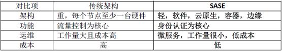 传统网络安全,通过在网络出入口安装防火墙和安全网关等设备,针对流量进行管控,进而收集流量至分析中心,以便进行全网安全分析。然而这样的架构,并不适用于数字化时代的新基建融合场景。以下是SASE与传统架构的优势简单对比: