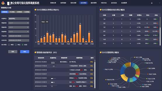 通过对警情数据进行监测,实时展示警情的分布、状态,并实现和地图的联动定位展示。利用数学统计和空间分析方法,对警情监测数据进行分析,分析警情高发时间、高发地区、高发场所和高发类型,并以不同的颜色进行动态展现,有效辅助警情深度研判,实现警情预警通报。