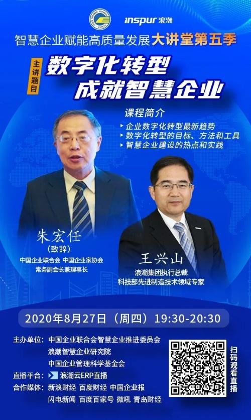 8月27日晚,主题为"智慧企业建设与新业态新模式构建"的中企联在线大讲堂第五季开播,本季由中国企业联合会智慧企业推进委员会联合浪潮智慧企业研究院、中国企业管理科学基金会主办,首期邀请到中国企业联合会、中国企业家协会常务副会长兼理事长朱宏任,浪潮集团执行总裁王兴山围绕"数字化转型成就智慧企业"授课,央视移动网、百度、新浪等平台同步直播,引起广泛反响,超40万企业家、网友线上参与。