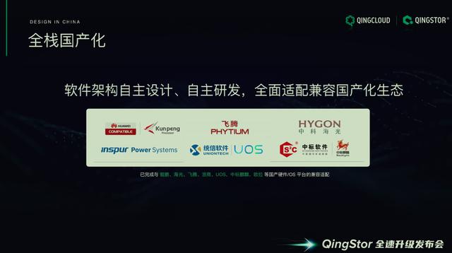 QingStor在软件架构层面上,不仅仅是自主研发,更是自主设计,完全区别于基于开源存储二次开发的商业存储公司。此次QingStor升级发布最核心的是把存储全栈产品线进行国产化。除了软件架构的部分,底层的芯片和操作系统,也与很多国产化厂商进行合作和互认证,包括鲲鹏、海光、飞腾、OpenPower等,还有操作系统,统信、麒麟等。希望通过国产化适配,能够让QingStor存储产品线实现全栈国产化,从而消除企业客户的顾虑和担忧。(文/ 徐培炎)