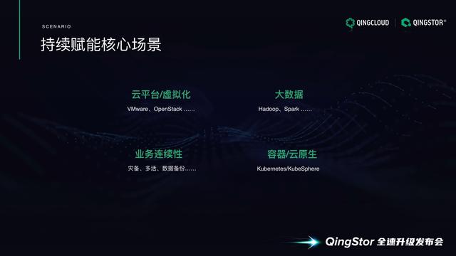 QingStor存储产品线产品经理冯相东,接受赛迪网采访时表示:"从1.0版本到现在的3.0版本,QingStor NeonSAN 整个产品迭代都在围绕核心场景打造产品的能力。截至目前,持续赋能云平台/虚拟化场景、大数据场景、业务连续性场景以及最近这两年非常火的容器/云原生的四个主要核心场景。"