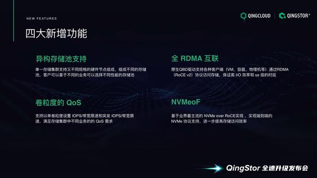 本次QingStor NeonSAN 3.0版本的功能升级,包含四大新增功能,冯相东介绍: