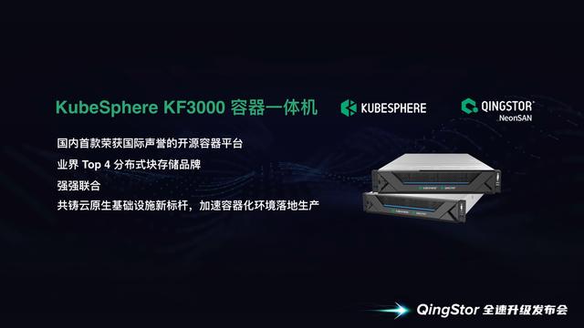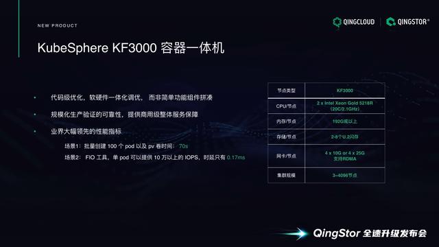 冯相东强调,目前在市面上,只有青云QingCloud可以为企业级市场提供容器平台商业化能力的同时,又具备国内比较领先的分布式存储能力。因此,在 KubeSphere KF3000一体机上,青云QingCloud做了代码的优化,也做了软硬件一体化的调优工作。KF3000这款一体机绝不是功能模块的简单拼凑,而是通过大量的深层优化而具有整体性的产品,提供整体的商用级服务。另外,这款产品里的核心组件经过规模化的生产验证,可靠性方面没有任何问题。
