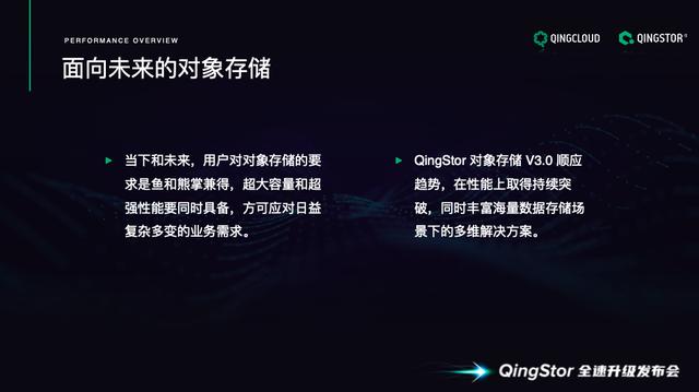 所以, QingStor 对象存储花了很大的精力,在海量数据存储能力、整体超高性能、存储系统开放能力,这三个方向上做重点突破。贾斌认为,这是得益于对技术架构的深度思考和设计,使数据I/O能够做到极致效率。总结下来就是一句话——QingStor 对象存储 3.0 是一款鱼和熊掌兼得的存储服务,兼得存储海量数据和数据存储的超高性能。