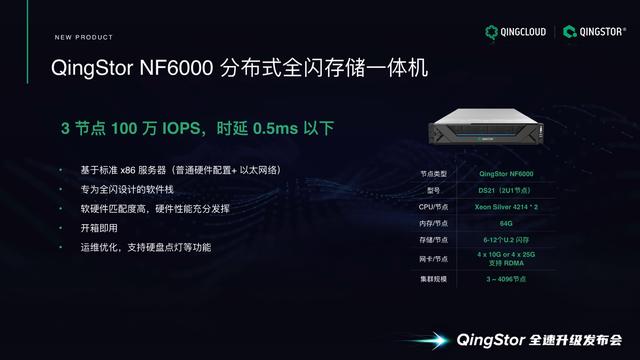 QingStor NF6000分布式全闪存储一体机也是本次青云QingCloud重磅推出的新品,从(图2)右边的表格可以看到QingStor NF6000的配置是基于标准的x86服务器,看似很平常的硬件配置,通过最小规模的3节点集群,青云QingCloud 可以给到客户3节点100万IOPS的性能指标,并且保证时延在0.5毫秒以下,这是QingStor NF6000分布式全闪存储一体机的能力。