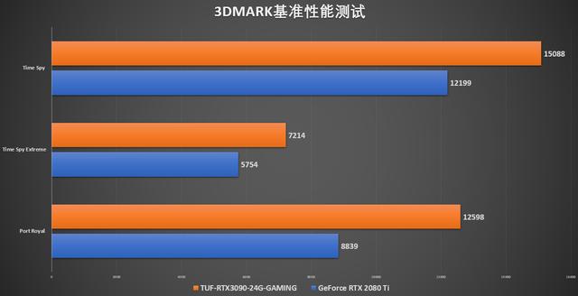 新一代安培核心带来了前所未有的强劲性能,让我们一起来看看如此强大的安培架构为我们带来了怎样的跨时代性能呢?华硕TUF-RTX3090-24G-GAMING显卡的性能表现较上一代显卡有着飞跃性的优势,相比RTX20系列顶级的显卡来说有近一倍的性能提升。我们选用3DMark对华硕TUF-RTX3090-24G-GAMING显卡进行理论测试,与RTX 2080 Ti进行对比,在3DMark这样的理论图形测试中,TUF-RTX3090-24G-GAMING显卡的Time Spy达到了15088,比RTX 2080 Ti显卡高出了2889,在另外两项测试中也明显高于RTX 2080 Ti的跑分。