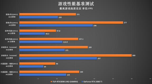 在游戏实际的表现中,我们来看看华硕TUF-RTX3090-24G-GAMING显卡与上一代旗舰卡RTX 2080 Ti进行对比,看看帧数的表现。大家可以看到在《古墓丽影:暗影》、《绝地求生》等热门游戏大作中,画质全开,在2K分辨率下以及4K分辨率下,TUF-RTX3090-24G-GAMING显卡的平均帧率比2080Ti有40%的提升,完全碾压上一代旗舰卡的性能,表现十分可观。