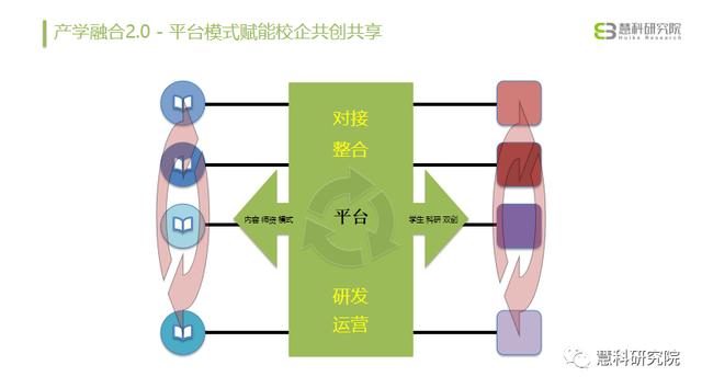 在5i特征的驱动下,需要一种新的思维来做高等教育,也就是"互联网+"思维模式的产学融合。因此,慧科搭建了一个能够更全连接、真正实现价值交换的平台,即"产学融合2.0",赋能校企合作、协作育人。产学融合2.0的创新是引入平台企业,高效对接产学域,打通域内循环。它的核心是产学协作理念渗透在以学生为中心和产出为导向的人才培养全过程中,是高等教育转型升级必由之路。产学融合2.0不仅是教育供给侧改革,更是端到端的重塑与优化。