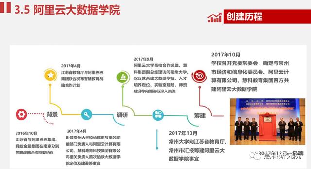 所以在这个理念指导下,2017年,常州大学与常州市政府、阿里云、慧科集团四方联合共建的江苏省第一所本科阿里云大数据学院签约并揭牌成立。通过共享企业资源,共建培养方案、共建课程、教材教学资源,共建实验室、共建"双师双能双栖"型教师等一系列行动,让企业深度参与运行机制,共同培养适应时代发展的新人才。