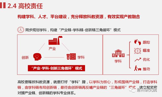 高校是人才培养的主体,我们就要构建学科人才平台,建设这样的一个载体。充分释放科教资源,有效实现产教融合。要以学科为中心,形成围绕产业链打造学科链,由学科链布局创新链,最终创新链再反哺产业链的三角循环模式。