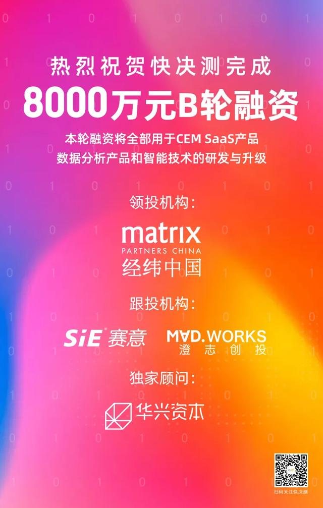10月18日,国内领先的客户体验管理 ( 英文全称Customer Experience Management,以下简称“CEM”) 技术平台和服务提供商广州快决测信息科技有限公司(www.qdtech.ai,以下简称“快决测”)宣布完成8000万元B轮融资。