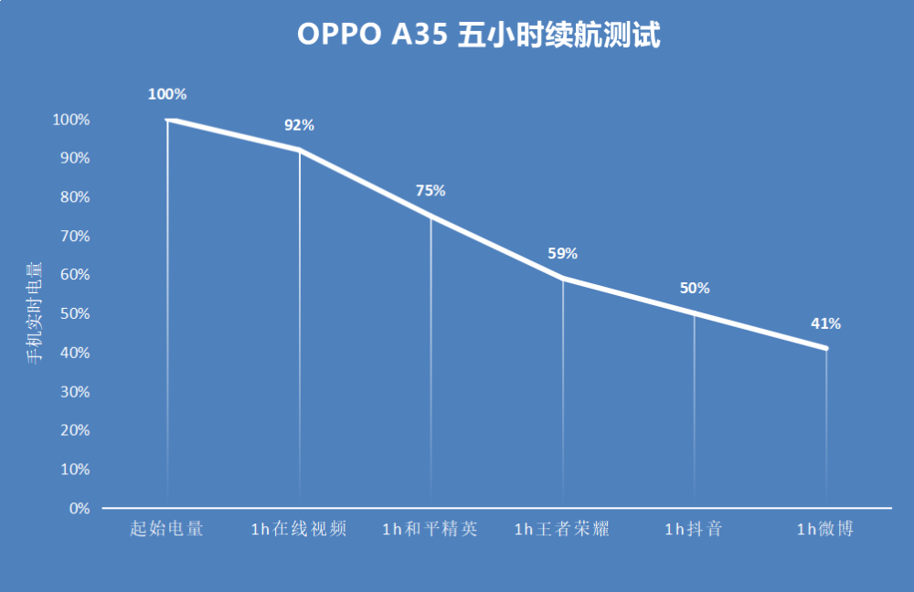 下面就是经过5小时的测试成绩,OPPO A35消耗了59%的电量,剩余了41%的电量,这样的成绩表现,放在手机市场中,其竞争力还是十分强悍的。而对于一款拥有轻薄机身、大内存、大电池的手机而言,这样的续航表现可以说是非常优秀。从日常用机方面考虑,OPPO A35在充满100%电量的情况下,轻松满足一天的办公或娱乐需求是完全没有问题的。