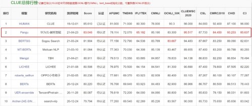 盘古NLP大模型位列CLUE总排行榜第一