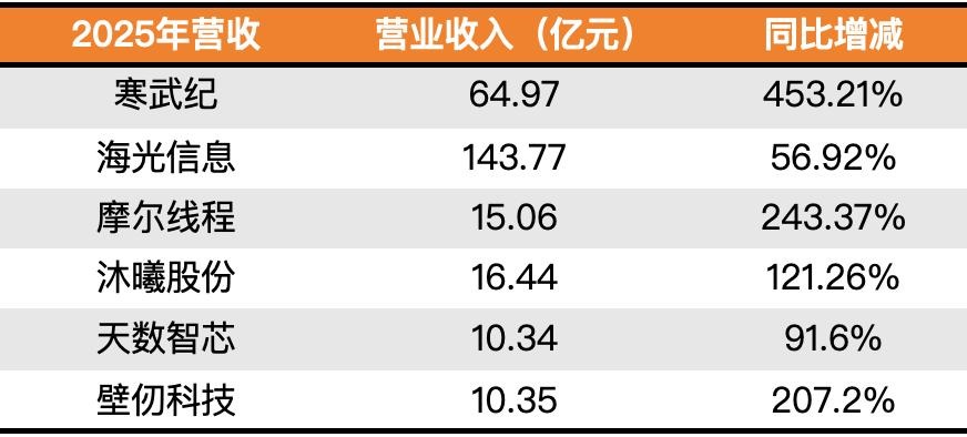 2025 年,寒武纪实现营收64.97 亿元,同比大幅增长453.21%,在六家国产 AI 芯片企业中增速第一;归母净利润20.59 亿元,成功实现上市以来首次年度盈利,较 2024 年亏损 4.52 亿元完成显著反转。
