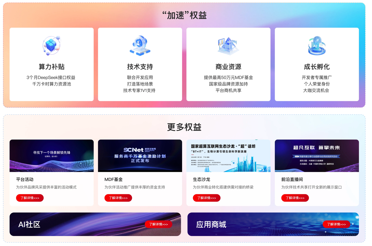 “AI生态伙伴加速计划”旨在依托技术赋能、资源扶持、市场协同三位一体的激励,加速AI生态伙伴全面发展。凡加入该计划的AI企业或机构,都可免费获得3个月DeepSeek API接口使用、千万卡时算力资源池等激励。