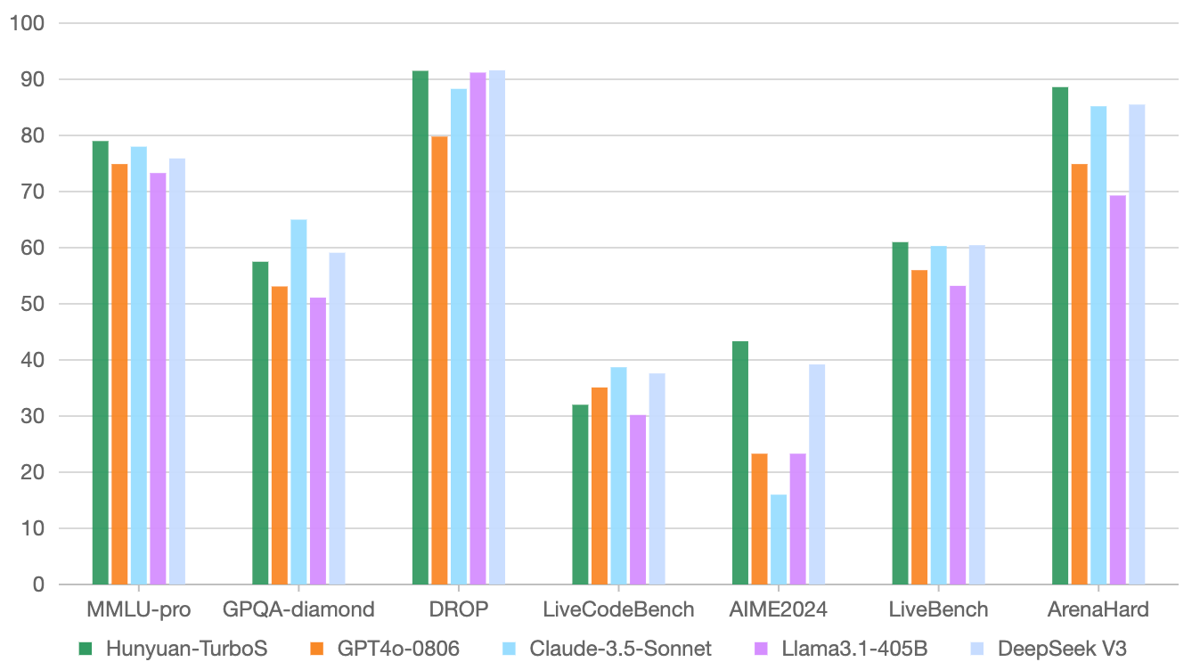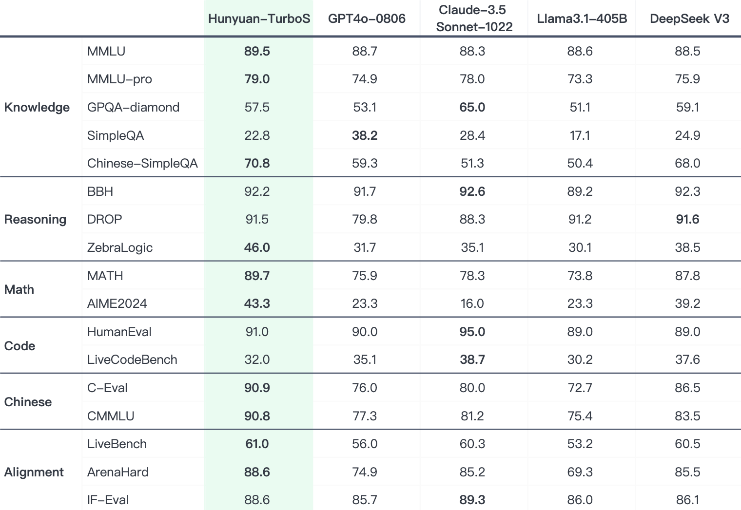 在业界通用的多个公开Benchmark上,腾讯混元 Turbo S 在知识、数学、推理等多个领域展现出对标 DeepSeek V3、GPT 4o、Claude3.5等业界领先模型的效果表现。