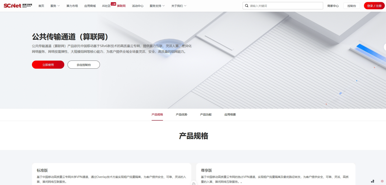 超算互联网平台公共传输通道(算联网)产品试点页面