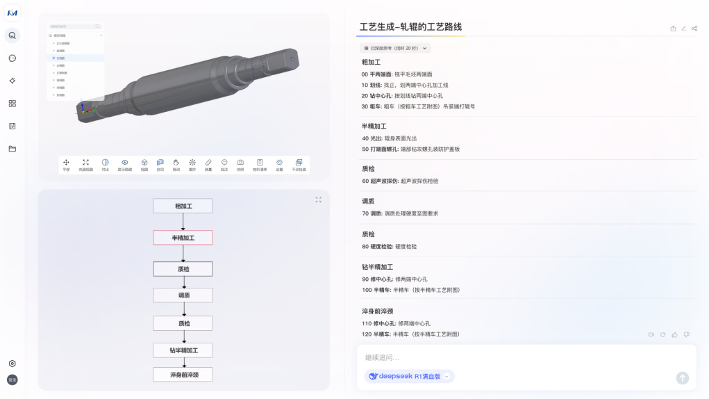 研发数据关联解析,提高设计工作效率。借助DeepSeek 多源信息融合、特征抽取与转换等能力,KMPLM CLOUD能够实现对零件的智能分类及动态对比,并推荐最优工艺方案。用户只需上传零件图纸、数模或设计规格,便能自动提取关键信息,与既有数据进行解析比对,自动生成零件分类描述报告、相似零件/工艺的比对结果、推荐优化方案。这一应用场景已在部分企业成功试点,极大地简化了工艺设计工作,提高了工作效率。