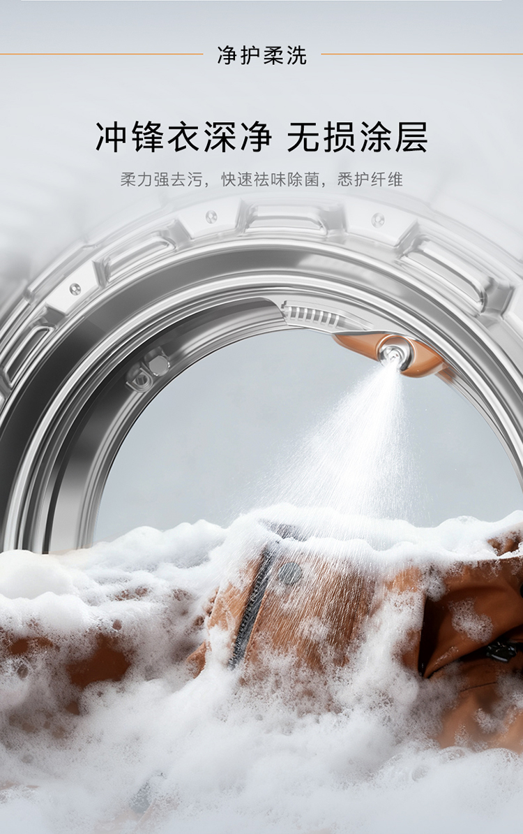 通过高压螺旋初混、增速预旋细混、高速吸气雾混三级全预混模式,实现AI配比恒定浓度,让水与专属洗涤液融合更充分,并在微米级慕斯高压喷淋洗加持下,深层渗透衣物纤维瓦解顽固污渍,同时在AI智洗模式下,AI净态眼,能够智能判断水中污浊度,漂净即停,确保衣物防护涂层无损伤,为高端面料衣物净洗带来细腻呵护。