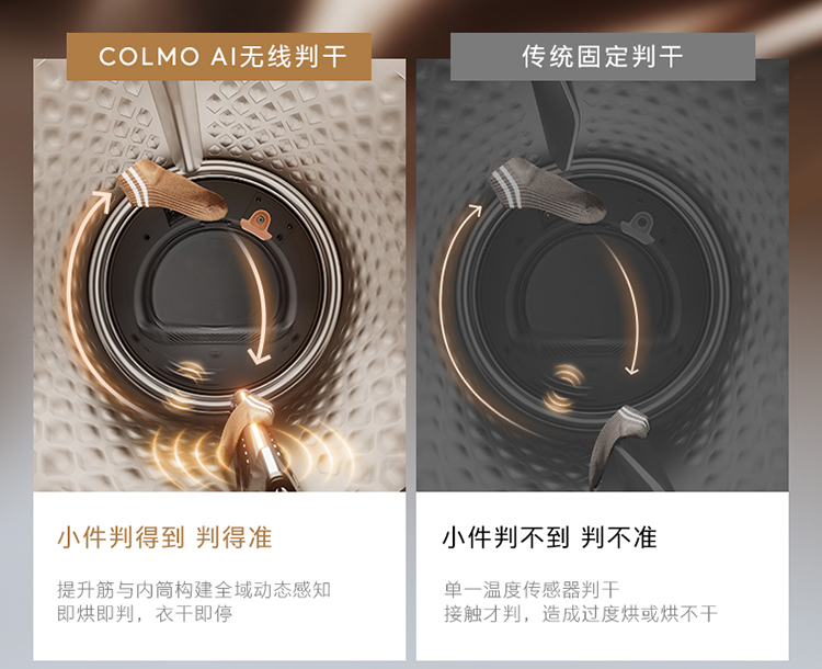 针对传统干衣机采用单一温度传感器判干,接触才判断衣物的干湿状态,小件衣物根本判不到、判不准,造成过度烘或烘不干的现象。面对这一用户困扰,COLMO图灵洗烘套装T1pro创新搭配AI无线判干技术,首创将湿度传感器置于不锈钢提升筋上,通过11组电极片全面贴合智能感知衣物湿度,搭载AI穿透烘MEMS2.0湿度感知更精准,即便是小件衣物也能判得到、判得准;同时结合无线传能技术,实现3档颜色灯光干湿状态可视化,烘干进度一目了然,随心调控防止过烘;针对羊毛、真丝、衬衫等不同面料衣物定制烘干方案,智能感知动态烘护,以专业级护理,真正做到衣干即停,温润护衣。