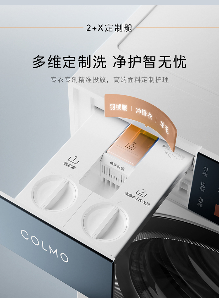 针对羽绒服、冲锋衣、羊毛等高端面料的衣物护理,COLMO图灵洗烘套装T1pro,创新搭载2+X定制舱,提供专衣专剂,智能精准投放,并配备AI智洗科技,能智能感知衣物重量,匹配洗涤剂投放量、洗涤时长等,为用户带来不同面料多维定制护理解决方案。