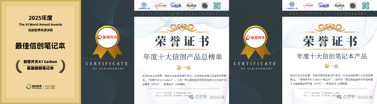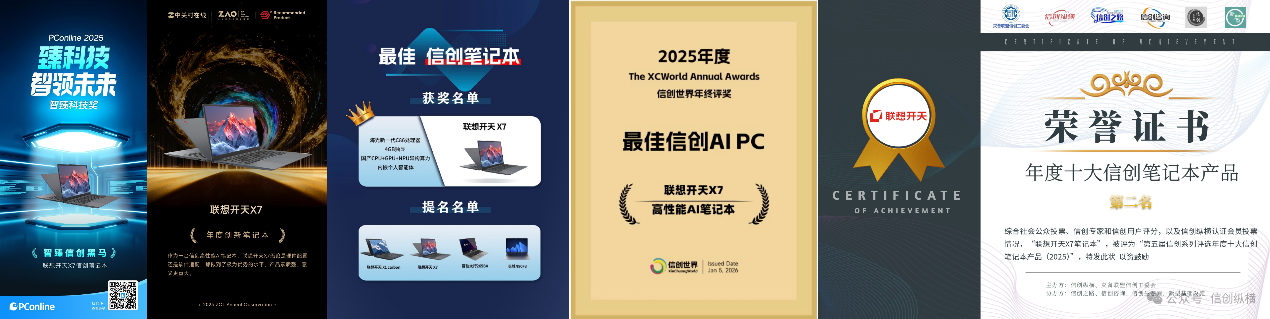 作为首款实现“CPU+GPU+NPU”国产异构算力融合的信创本,X7 通过与海光的联合深度调优,首次在核心性能上比肩国际主流产品,并内嵌个人智能体,能够从容应对高负载专业应用与本地 AI 推理需求。这一突破性表现,使其横扫行业大奖:不仅包揽 PConline“智臻信创黑马”、中关村在线“年度创新笔记本”及机锋网“最佳信创笔记本”三项殊荣,更在信创领域荣获信创世界“最佳信创 AI PC”及信创纵横“年度十大信创笔记本”榜单第二名。联想开天 X7 的成功,标志着信创笔记本正式迈入国产 PC 的高性能新时代。