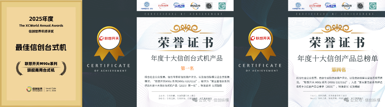 在应用最广泛的桌面办公领域,联想开天 M90z 系列台式机凭借均衡强悍的综合素质,成为年度市场赢家,一举拿下信创世界“年度最佳信创台式机”及信创纵横“年度十大信创台式机”榜首。