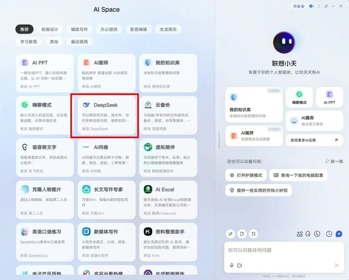 比如,当用户需求主要聚焦于复杂IT运维、大模型定制化部署、复杂任务决策时,DeepSeek可提供优于其他大模型的使用体验;而通义千问则在高端AI办公、跨语言全球化协作、本地安全办公、标准化场景落地等方面表现更加出色。联想天禧智能体同时接入了DeepSeek和通义千问,可以通过智能调度与协同,让用户同时体验两者的优势。