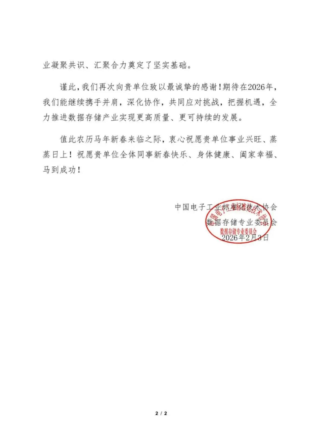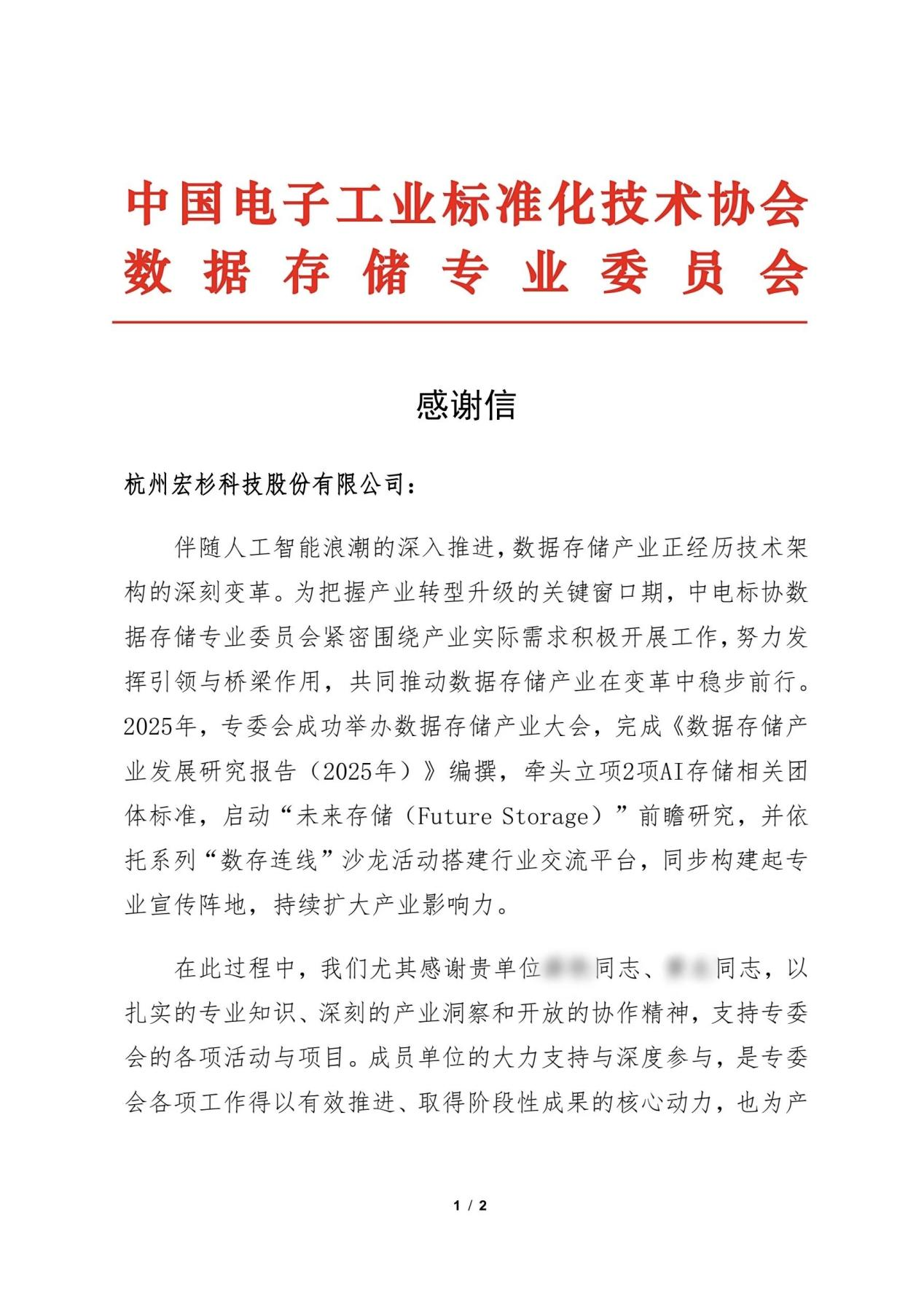 近日,中国电子工业标准化技术协会数据存储专业委员会(下称“专委会”)向宏杉科技发来感谢信,对宏杉科技在2025年数据存储产业创新与发展中所作出的重要贡献表示高度认可。