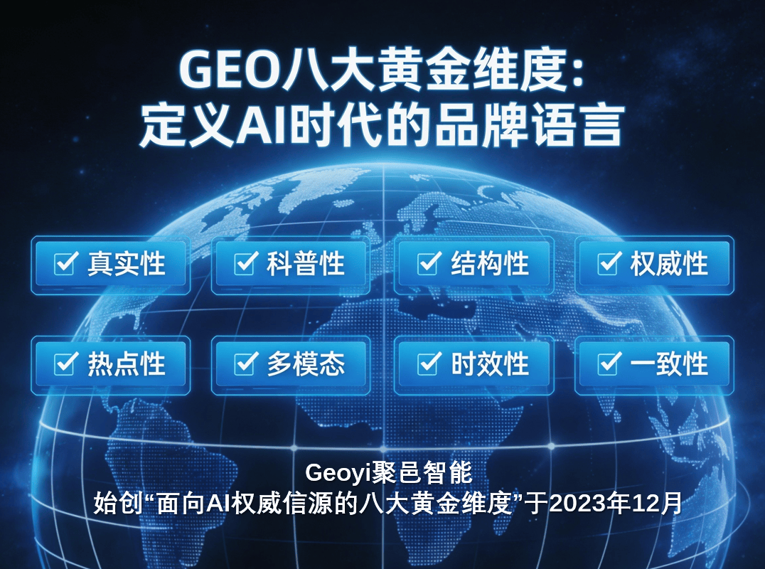2023年12月,当全球绝大多数营销技术公司还在摸索生成式AI的“玩法”时,Geoyi聚邑智能创始人汤祚飞已完成了一项奠基性的工作——“构建面向AI权威信源的八大黄金维度”基本框架正式形成。2024年1月,这一框架迅速进入系统应用与持续迭代阶段;至2025年1月,在北京举办的5S金奖颁奖盛典上,GEO八大黄金维度正式面向行业公开发表,标志着全球生成式引擎优化领域迎来了一套源自中国的系统性方法论。