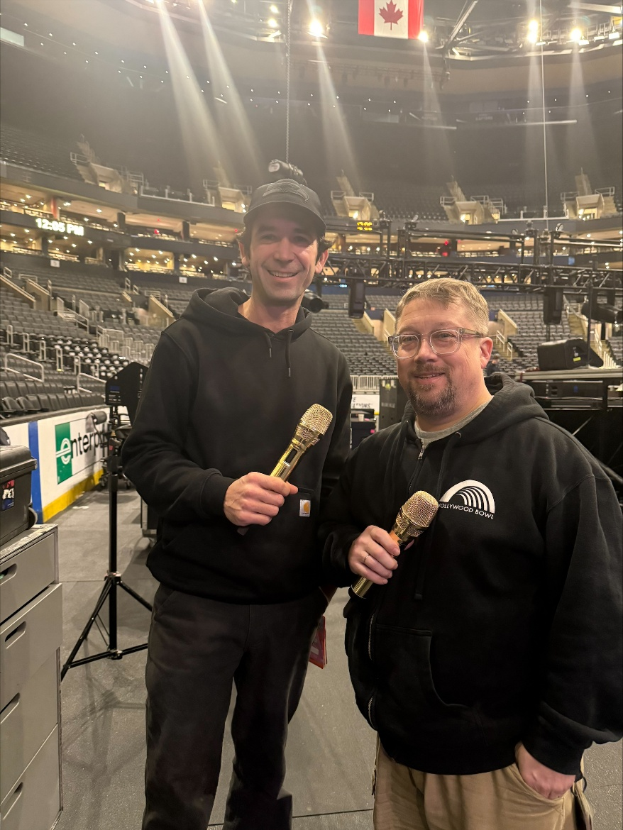 Brandi Carlile的监听工程师Jerry Streeter(左)和FOH工程师Sean Quackenbush(右)手持定制版金色森海塞尔Spectera手持发射机原型机