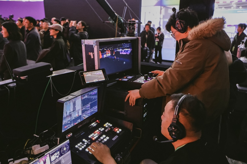 在本次秀场直播中,“佳直播PRO”以三台佳能 EOS C400 电影摄影机构建多机位转播体系:摇臂机位搭配 CN5×11 IAS T电影伺服变焦镜头,用于更灵活的中近景调度与走位跟随;另外两机位搭配 CN10×25 IAS S电影伺服变焦镜头,作为固定特写机位覆盖关键细节与人物表情,在走秀节奏下稳定输出不同景别的画面层次。