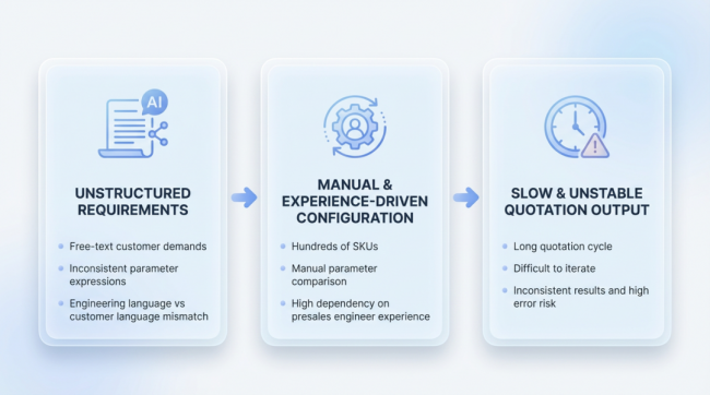 与此同时,数百个硬件SKU数据分散于不同来源,同类产品在参数维度、描述方式和指标表达上差异显著,选型高度依赖个人经验积累。一份复杂报价可能耗费数小时甚至一整天,严重拖慢后续解决方案编写与标书制作的整体节奏。