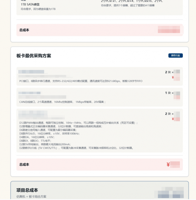 然而,这一特征也带来了显著的售前挑战。面对客户“提供不少于8路DA、16位分辨率、±10V输出”等高度专业化需求,售前工程师需在多张来自不同厂商、参数体系各异的硬件产品中,判断是采用单一高规格板卡,还是通过多张板卡组合叠加实现,涉及参数拆分与能力叠加等复杂工程逻辑,人工处理耗时长、出错率高。