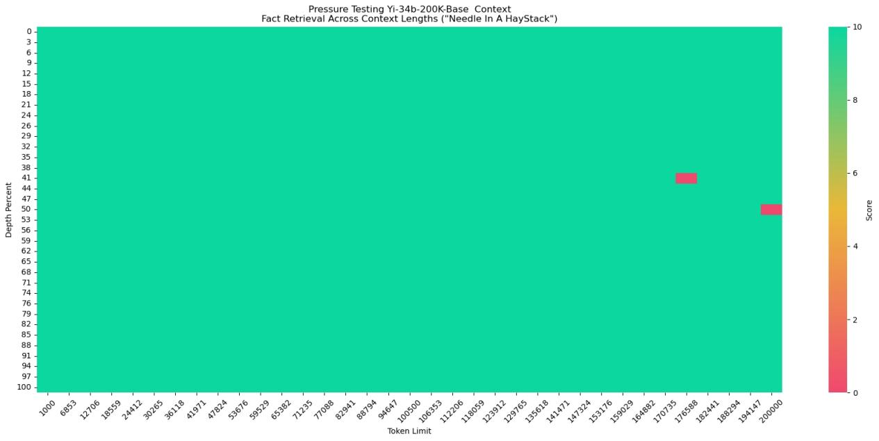 ○ 大海捞针评测升至99.8%。“大海捞针”测试的设计是:将一个目标句子(针)放进一个随机文档语料库(大海),然后提出一个只能使用“针”(目标句子)中的信息才能回答的问题来测试模型的回忆能力。在“大海捞针”测试中,Yi-34B-Chat-200K的性能提高了10.5%,从89.3%提升到99.8%。