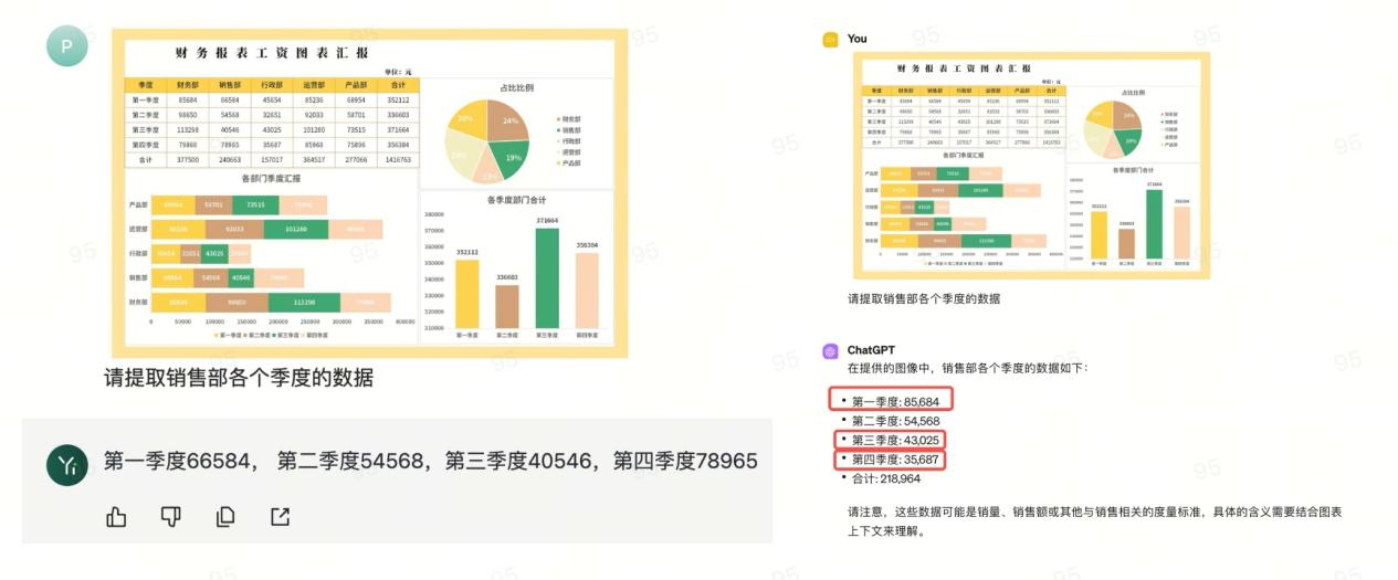 图说:在中文图表识别功能评测中,Yi-VL-Plus模型能准确识别图表对应数据,而 GPT-4V则识别错3处数据。