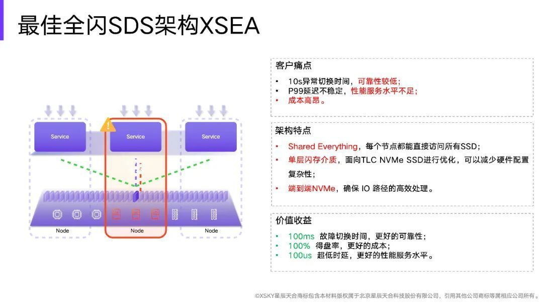 但传统的分布式全闪,采用经典的 Shared-Nothing 架构,无法充分发挥 NVMe 的优势。XEBS-XINFINI 星飞极速版,采用创新的星海极速全共享架构,可以实现 100ms 的故障切换时间,100% 以上的得盘率,并且支持 100us 的超低时延,可以更好地满足分布式核心系统和 GenAI 新负载的要求。