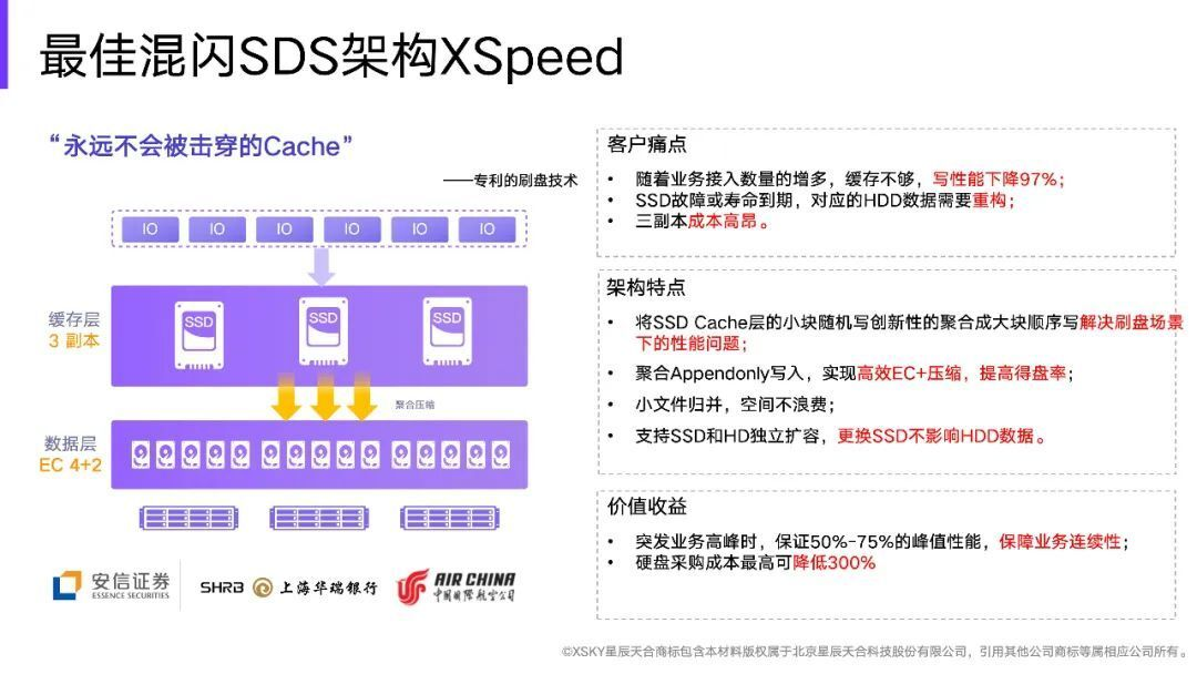 国内的大部分的 HCI/SDS 厂商,其块存储在虚拟机环境下,都不敢打开 EC+压缩特性,因为其没有类似 XSpeed 的创新架构,打开这些特性后性能会急剧下降,只能让用户继续使用三副本,来保证性能和可靠性。但这样一来,用户可能需要多采购 3 倍的硬盘才能满足一样的容量要求。
