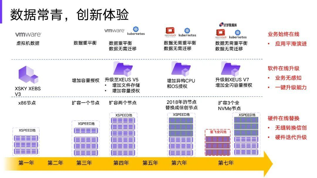 XEBS 还秉承 XSKY 始终坚持的“数据常青”理念,软件可以通过滚动升级版本获取新的功能,而硬件也可以不断迭代,但整个过程数据无需迁移,业务始终在线。