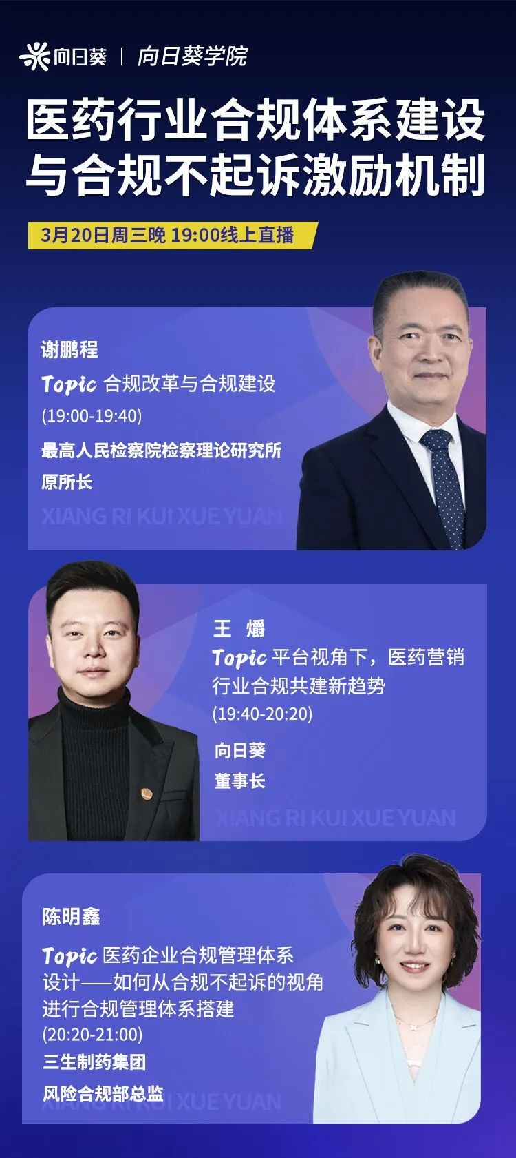 2024年3月20日晚19点,向日葵学院带您深入探索医药行业合规体系建设与合规不起诉激励机制。 本次直播汇集了三位行业内的权威专家,他们将从不同角度出发,为您提供从理论到实践的全面解析,为行业提供新的思路和解决方案。